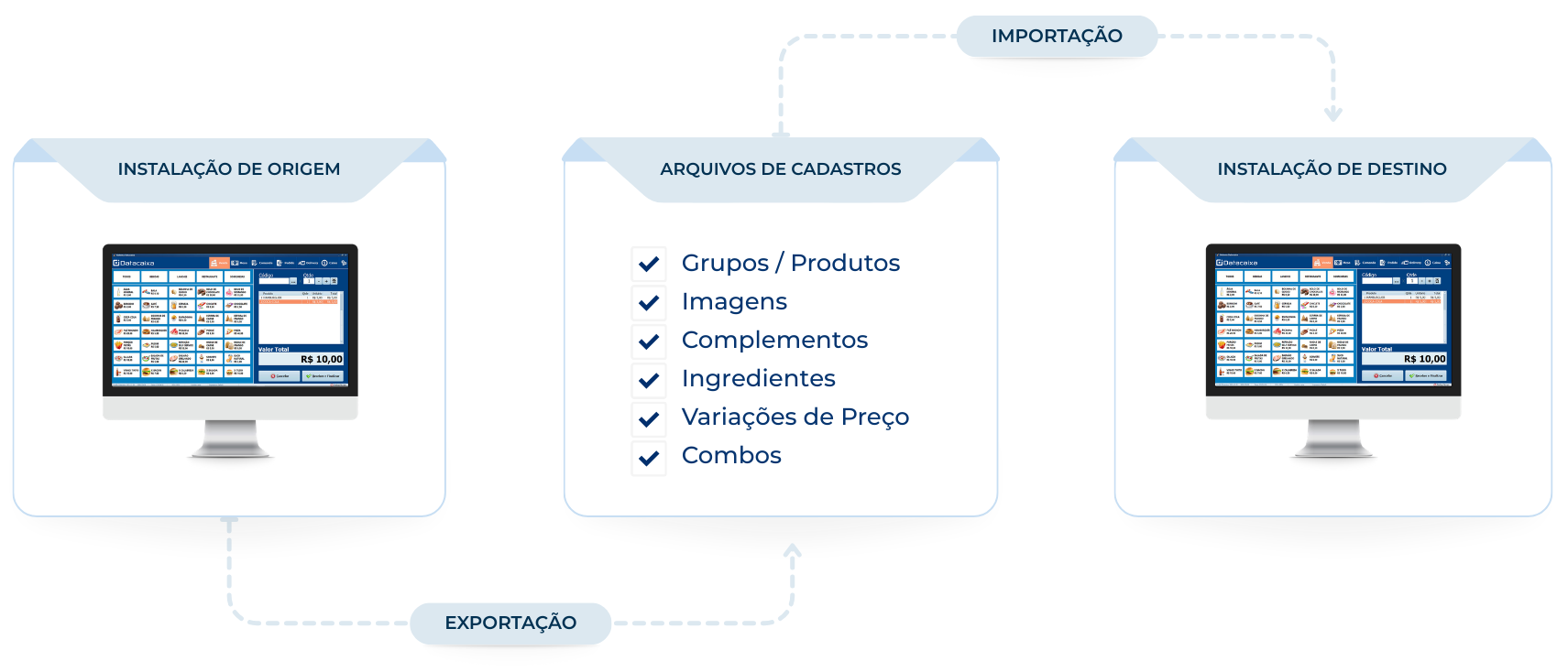 Na instalação de destino (Servidor), onde os cadastros serão importados, o sistema recebe o arquivo com todos os cadastros e substitui os dados existentes, mantendo a estrutura e os dados como foram configurados.