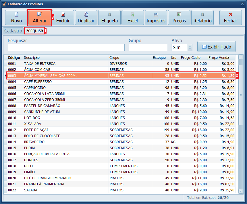 2- Em Pesquisa, selecione o produto que deseja inserir a imagem e clique em Alterar.
