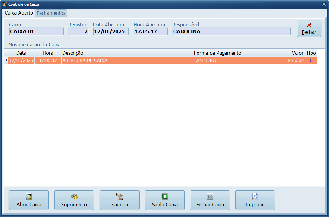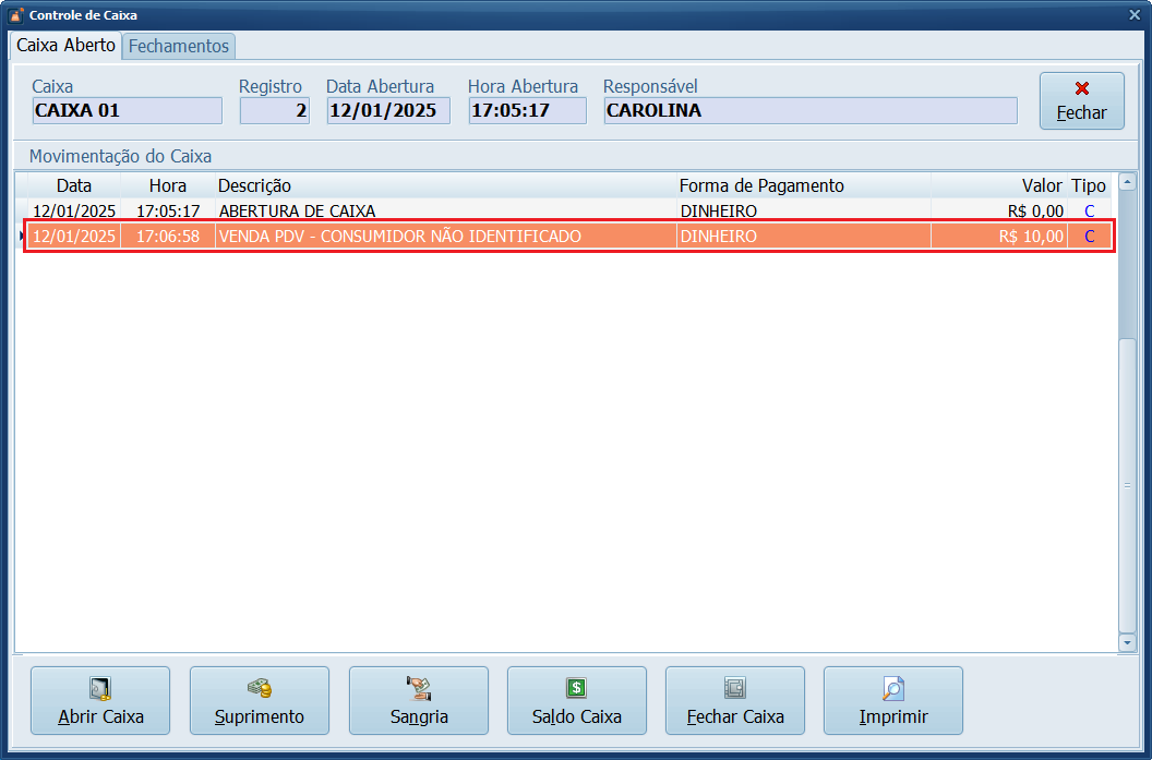 Para exemplificar, temos abaixo um Caixa Aberto com uma venda realizada no dinheiro, no valor de R$10,00.