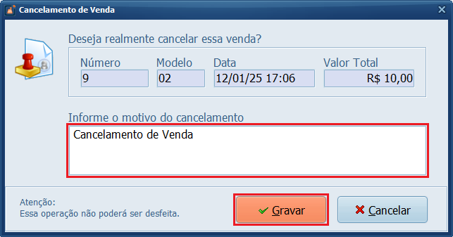 3- Se desejar, informe o motivo do cancelamento. Em seguida, clique em Gravar > OK.