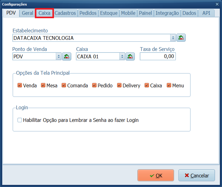 3- Habilite a opção Ao cancelar uma venda estornar o valor do caixa aberto automaticamente. Depois, clique em OK.