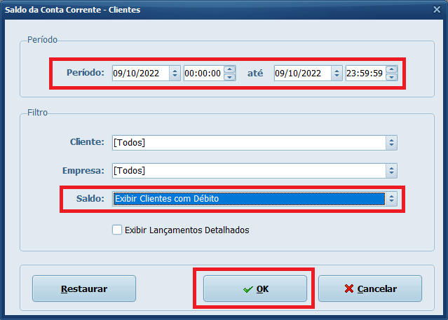 3- Ajuste o Período e em Saldo selecione Exibir Clientes com Débito.
