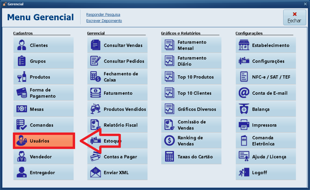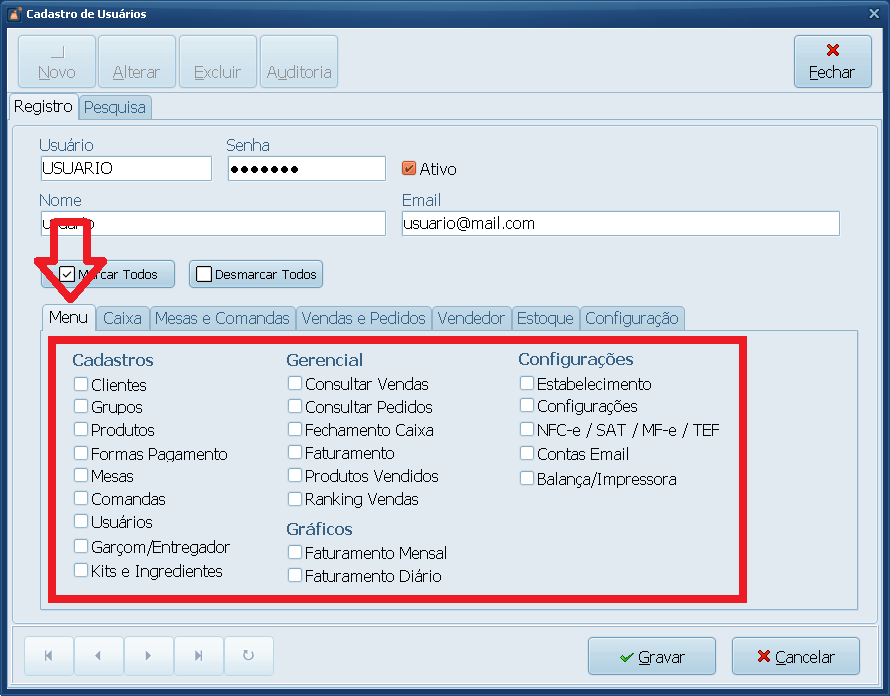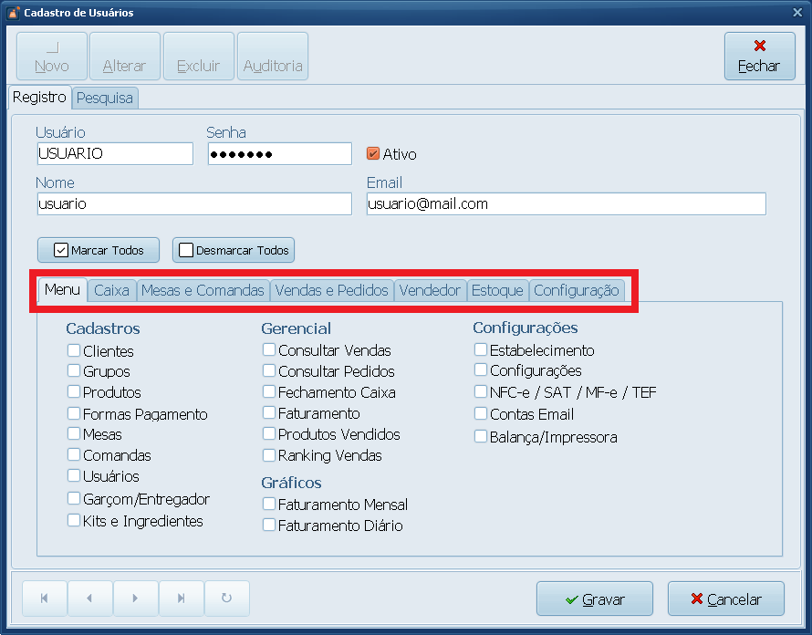 Na aba Menu é possível verificar as configurações referentes ao Menu Gerencial, os parâmetros habilitados é o que dará permissão ao usuário como cadastrar clientes e produtos, verificar relatórios e gráficos, ou até mesmo as configurações do sistema.