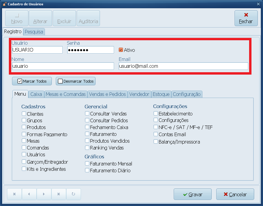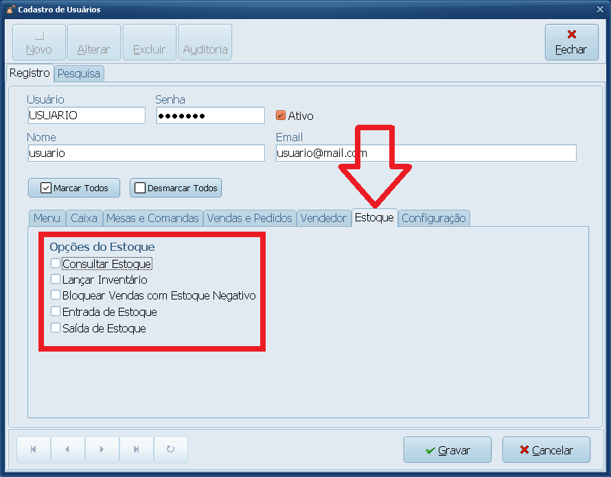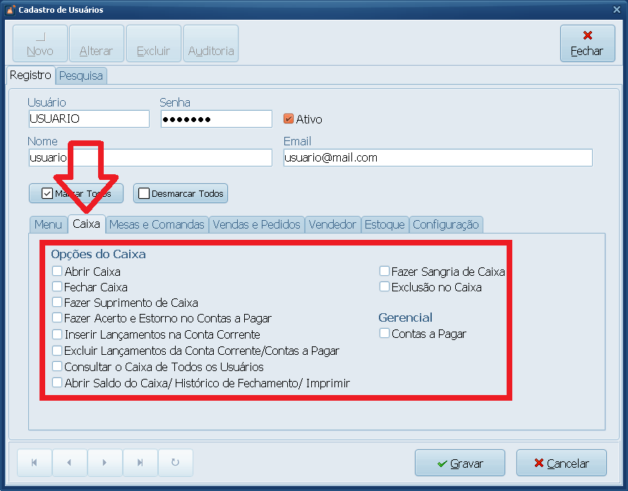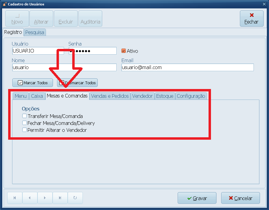 A imagem acima destaca as abas presentes na tela de usuários. Cada aba representa as permissões que este usuário pode ou não fazer no Sistema.