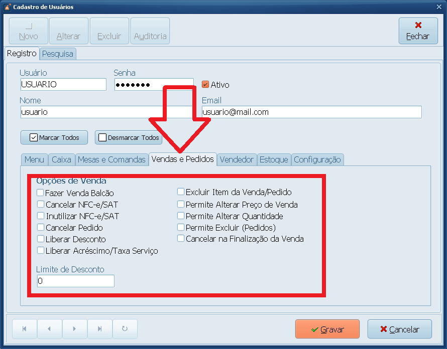 Também poderá ajustar um Limite de Desconto para que esse usuário não ofereça um desconto acima do permitido.