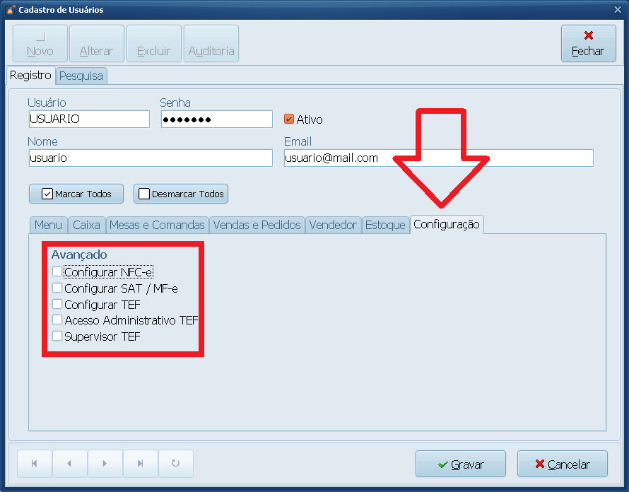 Dentro desses parâmetros você poderá permitir que seu usuário configure o TEF, o SAT ou MFE, ou até mesmo a emissão do Cupom Fiscal.