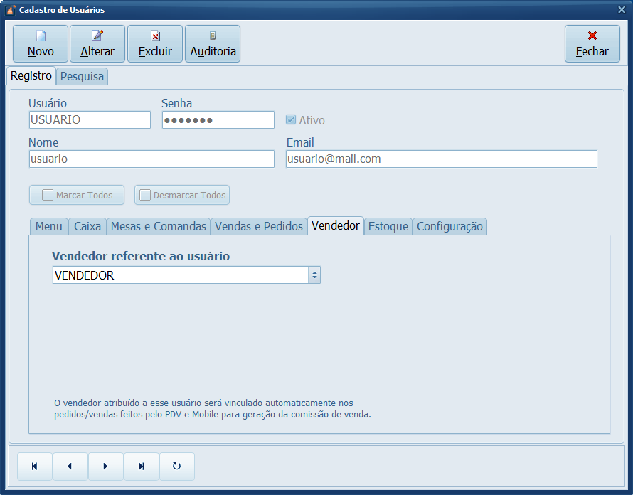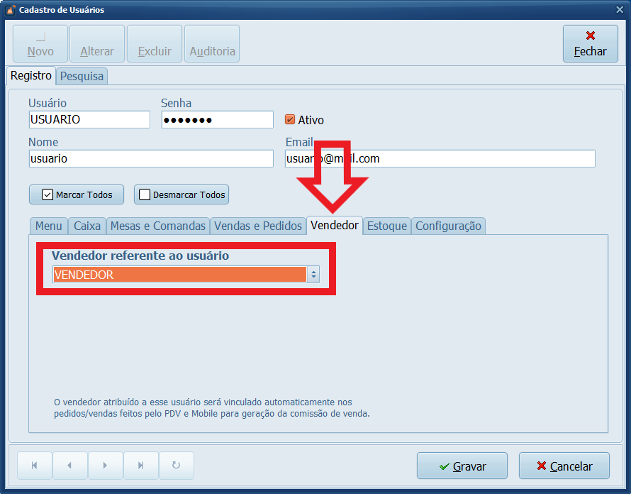 A aba Vendedor serve para vincular o usuário a um vendedor já cadastrado no sistema, ele também será vinculado no módulo de mesas e comandas, e também no Comanda Mobile.