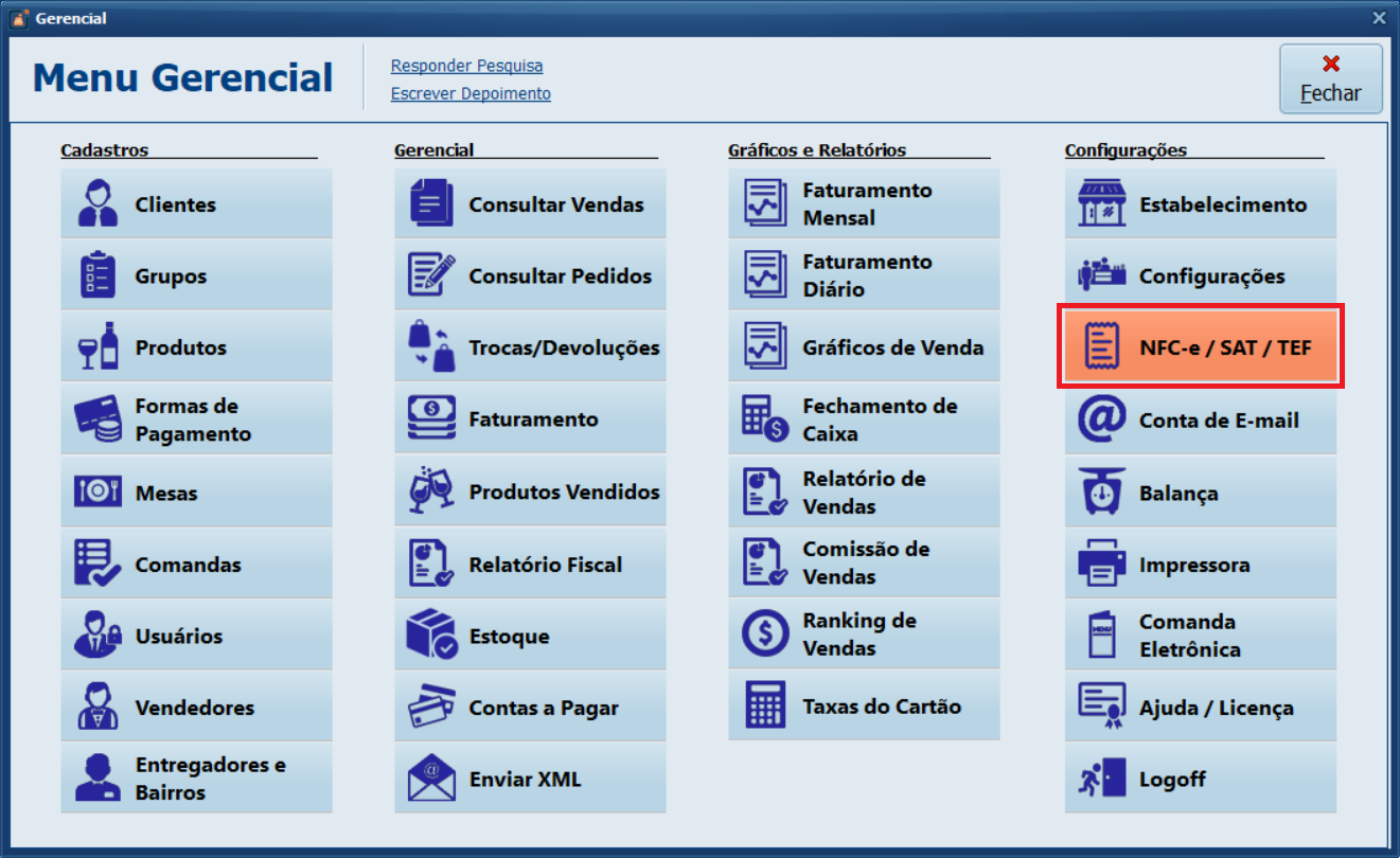 1- Acesse Menu Gerencial > NFC-e/SAT/TEF.