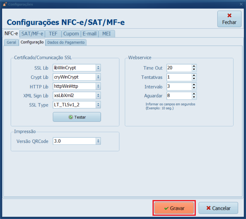• Por padrão, o PDV continua utilizando o QR-Code 2.00. Nesse caso, mesmo após a atualização, é necessário alterar manualmente para a versão 3.00, seguindo os passos indicados abaixo.