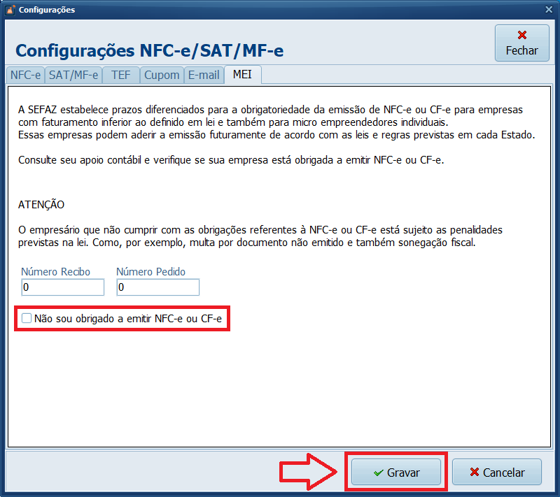 5- Na aba MEI, desmarque o parâmetro Não sou obrigado a emitir NFC-e ou CF-e e clique em Gravar.