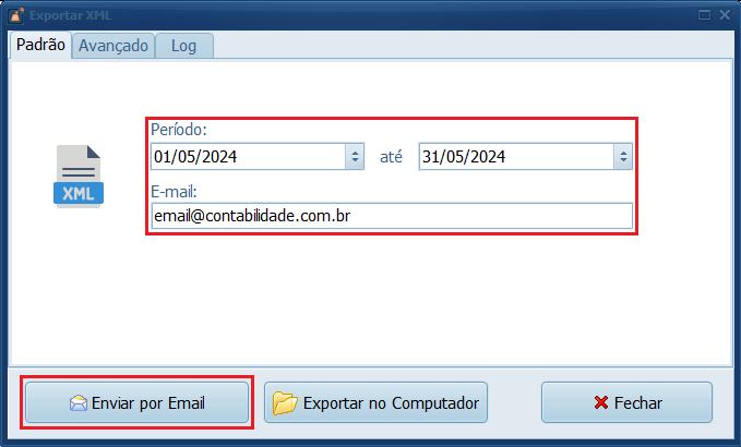 3- Informe o Período que deseja enviar os XML, informe o E-mail da contabilidade e clique em Enviar por Email.
