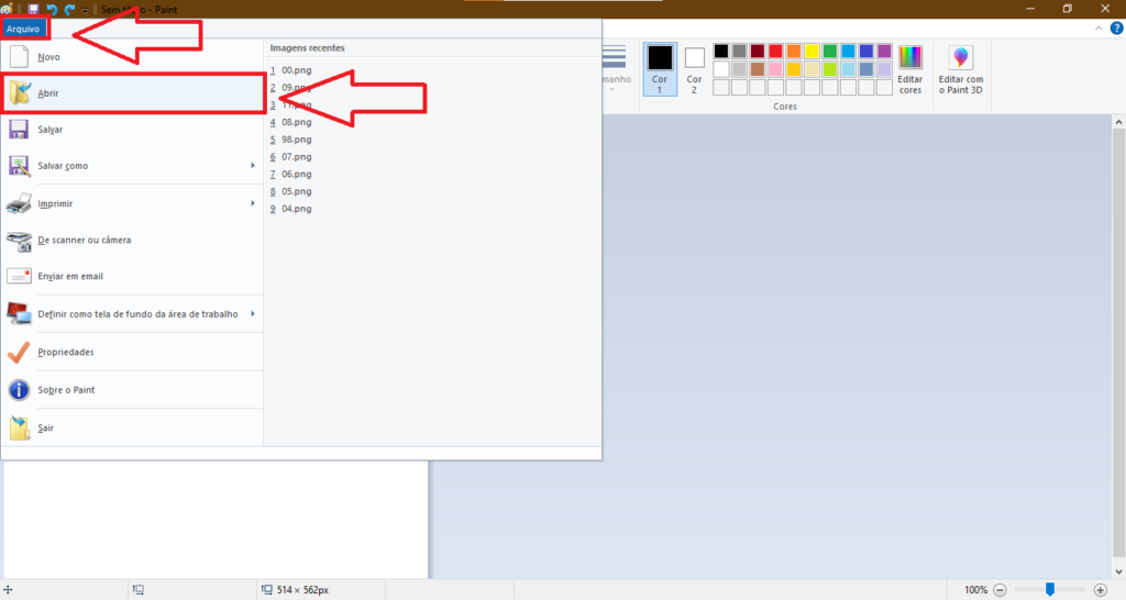 2- Com o Paint aberto clique em Arquivo > Abrir.