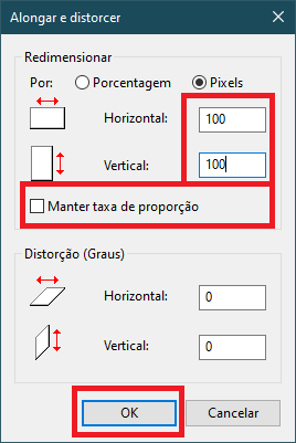 5- Selecione Pixels, desmarque a opção Manter taxa de proporção e informe Horizontal 100 e Vertical 100, clique em OK.