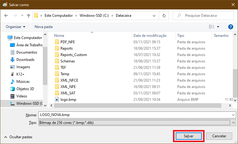 7- Escolha um local para salvar a imagem, para ficar mais fácil de encontrar salve na pasta Datacaixa.