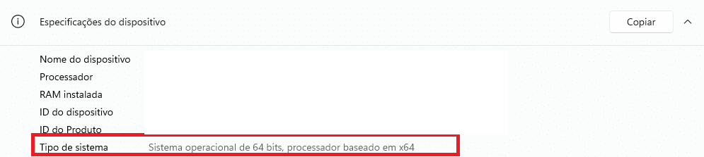 6- No tutorial da Microsoft você será orientado a verificar se seu computador é 64bits ou 32bits. Acesse: Iniciar, conforme passo 1, pesquisando por ‘Sistema’. No campo ‘Tipo Sistema’ você pode confirmar essa informação.