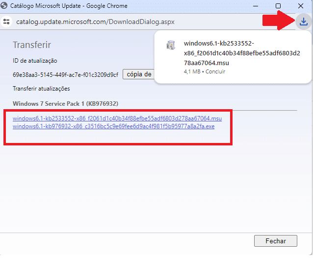8- Ao clicar em transferir a tela de download será aberta. Clique no link em azul e aguarde o download finalizar. Quando finalizar você pode clicar na setinha de arquivos baixados para executar o pacote de atualização.