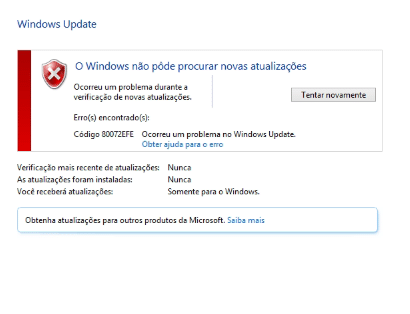 Caso você utilize uma versão mais antiga, como o Windows 7. Ao realizar o procedimento de verificar se há novas atualizações, conforme o passo 2 acima. Pode ser que você se depare com esse erro na atualização, dependendo da versão de seu sistema operacional. Isso se deve ao fato de que o suporte a esses sistemas foi descontinuado pela Microsoft, conforme publicado em seu site oficial: