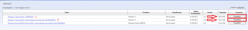 7- Após confirmar a versão de seu Windows, clique aqui para acessar o cátalogo de atualizações da Microsoft. Selecione a opção 1 caso seu computador seja 32 bits ou opção 2 caso seu computador seja 64bits.