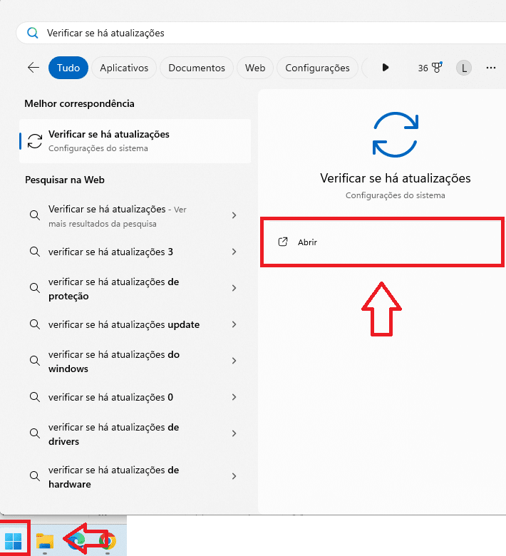 1- No canto inferior esquerdo, na barra de tarefas do Windows, acesse o Iniciar. Pesquise por ‘Verificar se há atualizações’ e clique em abrir.