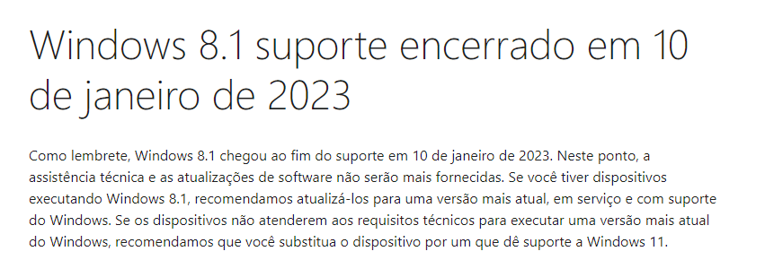 Anúncio Windows 8 – Fonte: https://support.microsoft.com/pt-br/windows/windows-8-1-suporte-encerrado-em-10-de-janeiro-de-2023-3cfd4cde-f611-496a-8057-923fba401e93#:~:text=N%C3%A3o.,receber%C3%A1%20mais%20atualiza%C3%A7%C3%B5es%20de%20seguran%C3%A7a.
