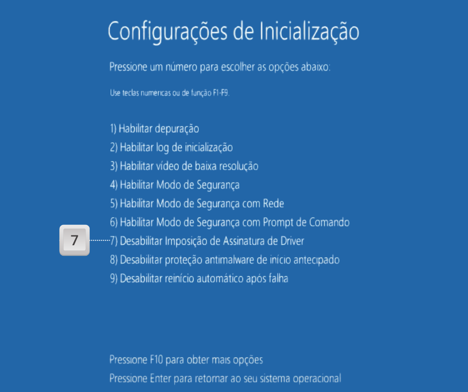 8- Pressione a tecla numérica 7 ou a tecla de função F7 para selecionar a opção Desabilitar Imposição de Assinatura de Driver.