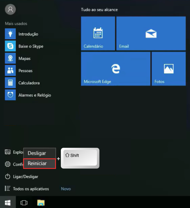 2- Mantenha pressionada a tecla Shift e clique em Reiniciar.
