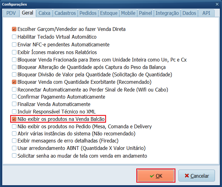 4- Marque o parâmetro Não exibir produtos na tela de venda (Balcão) e clique em Ok.