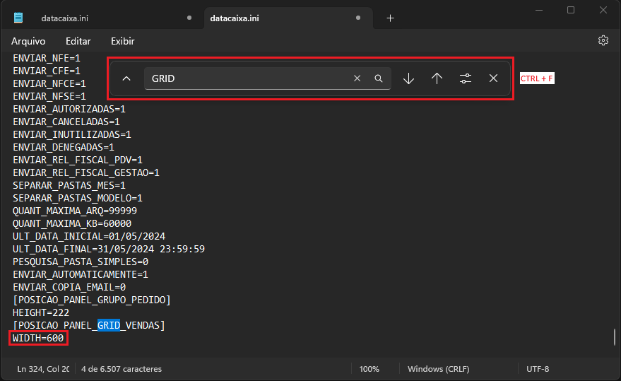 3- Aperte Ctrl + F no teclado e procure por GRID. Altere o campo WIDTH de 0 para 600