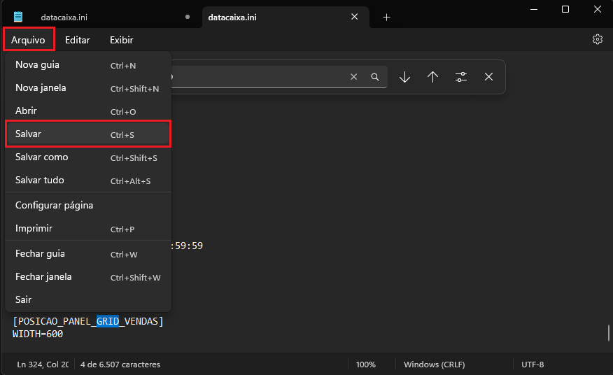 2- Acesse a pasta do Sistema e procure pelo arquivo datacaixa.ini, e abra o arquivo no bloco de notas.