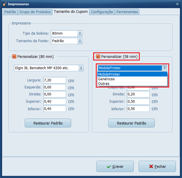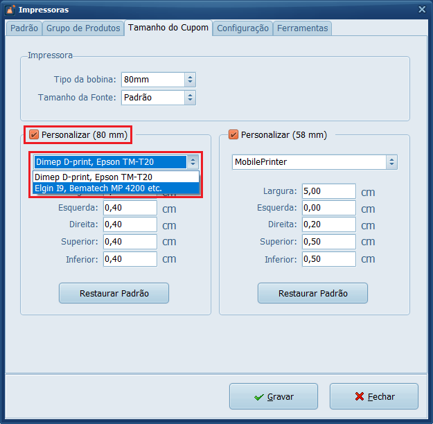 5- Mantenha selecionado a opção Personalizar (80 mm) ou Personalizar (58 mm), conforme o tipo de bobina da impressora. Em seguida, selecione o modelo da impressora na lista.