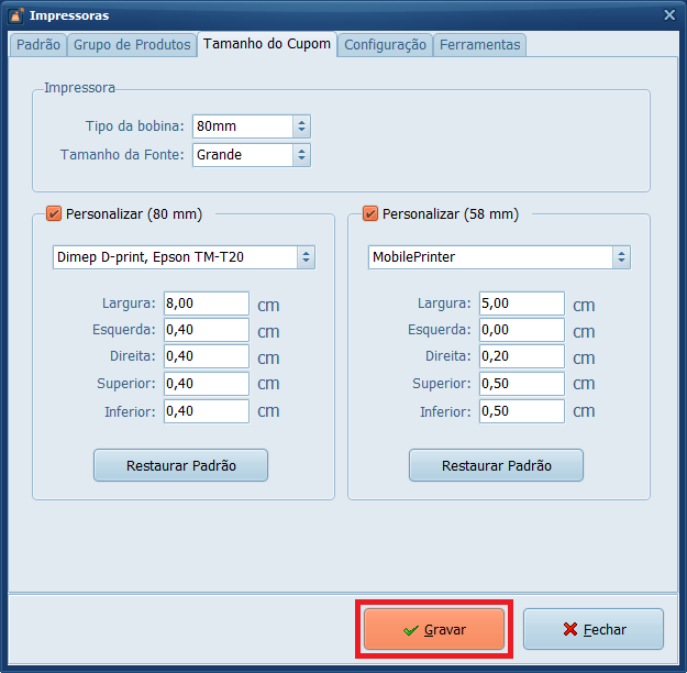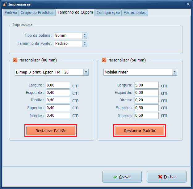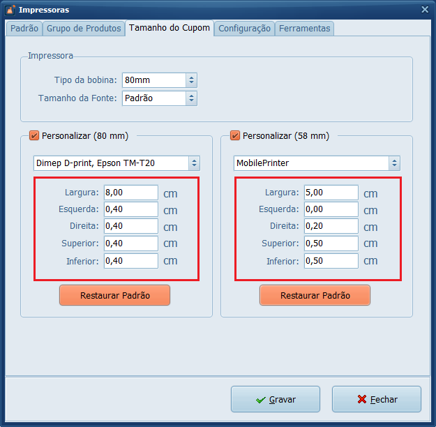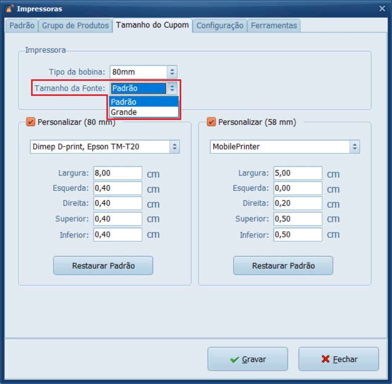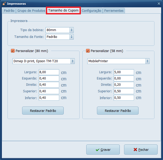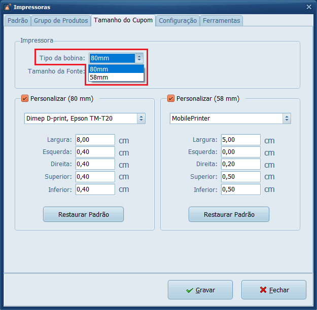 3- Em Tipo da bobina, selecione o tamanho correto, como 80mm ou 58mm, conforme o papel utilizado na impressora.
