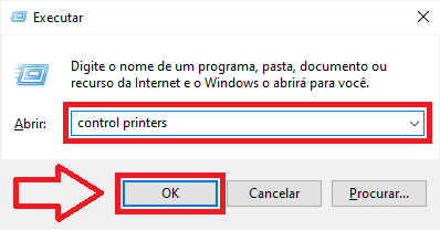 1- No teclado pressione as teclas de atalho Windows + R para abrir o Executar, ou clique com o botão direito no botão Iniciar e depois clique em Executar. No Executar informe em Abrir control printers e clique em OK.