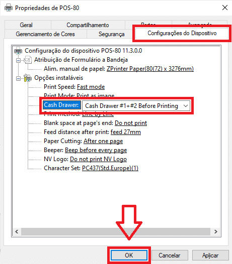 Exemplo numa impressora POS-58 ou POS-80, em Cash Drawer selecione Cash Drawer #1+#2 Before Printing e clique em OK.