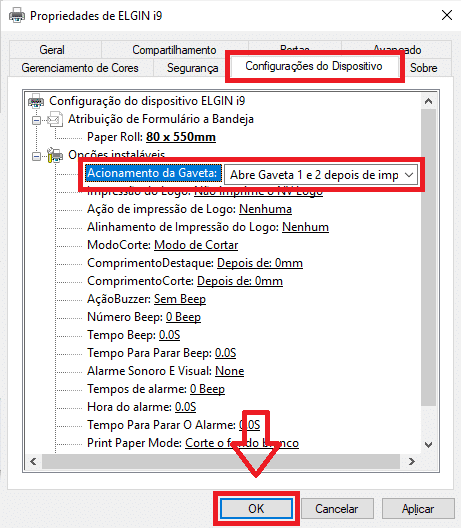 Exemplo numa impressora ELGIN, em Acionamento da Gaveta selecione Abre Gaveta 1 e 2 depois de imprimir e clique em OK.