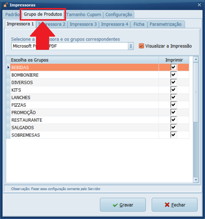 4- Na aba Grupo de Produtos poderá selecionar qual impressora deve imprimir um determinado produto. Por exemplo, na Impressora 1, selecionando a impressora do BAR pode selecionar somente Bebidas para imprimir nesta impressora e na Impressora 2, selecionando a impressora da COZINHA, pode selecionar CARNES, LANCHES e PIZZAS.