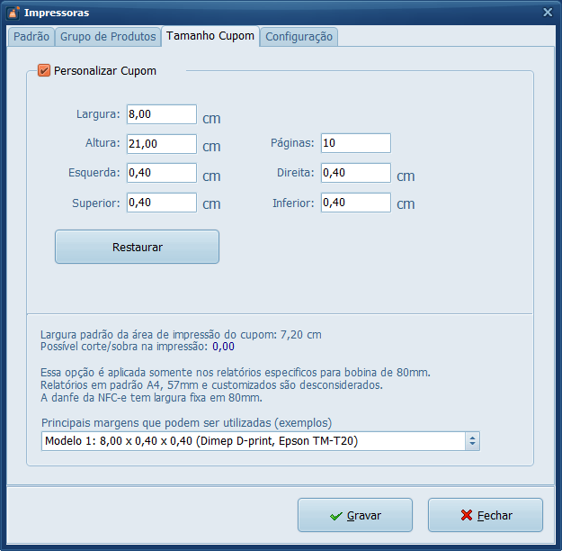 5- Na tela de Tamanho Cupom é possível ajustar as margens da impressão evitando que algumas informações fiquem cortadas na impressão.