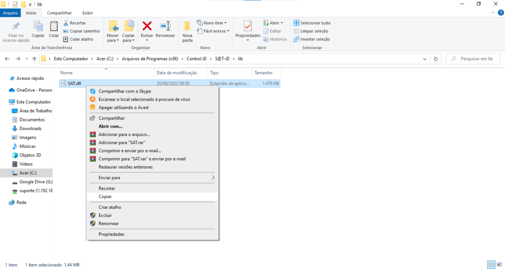 4- A DLL do SAT sempre terá um nome parecido com sat.dll, pode ser dllsat.dll, no modelo Bematech poderá estar como bemasat.dll, ou como neste modelo SAT.dll. Selecione o arquivo SAT.dll, clique o botão direito e clique em Copiar.