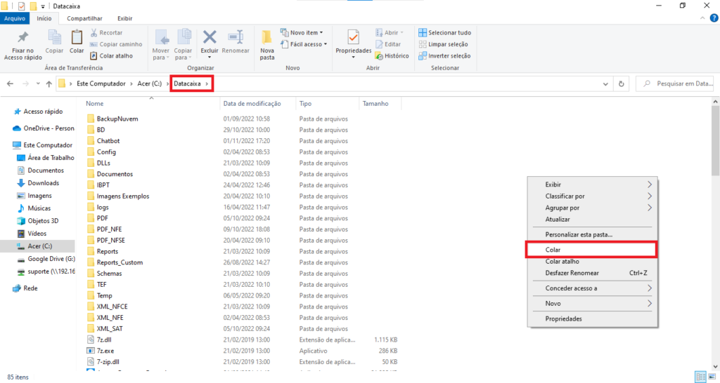 5- Na pasta Datacaixa, clique com o botão direito e depois em Colar.