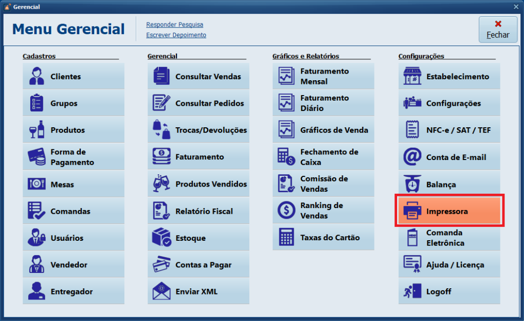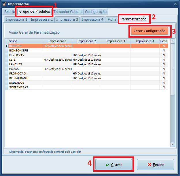 Pronto! Você zerou a parametrização das impressoras no Sistema, agora basta reconfigurar o Grupo de Produtos.