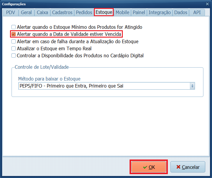 2- Na aba Estoque, selecione o parâmetro Alertar quando a Data de Validade estiver Vencida > Ok.