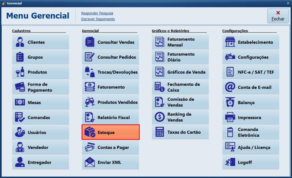 1- Acesse o Menu Gerencial e clique em Estoque.
