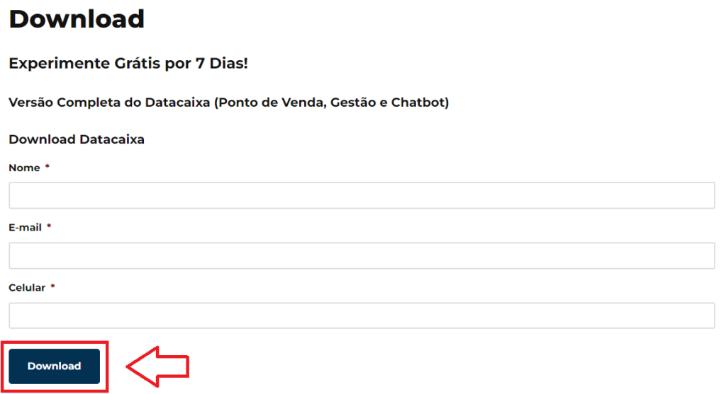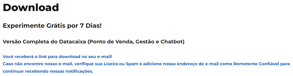Nós disponibilizamos o download do Sistema para você conhecer e aproveitar todos os recursos, sem nenhum custo durante 7 dias, nesta instalação poderá conhecer nossos Sistemas Datacaixa PDV, Datacaixa Gestão e Datacaixa Chatbot.
