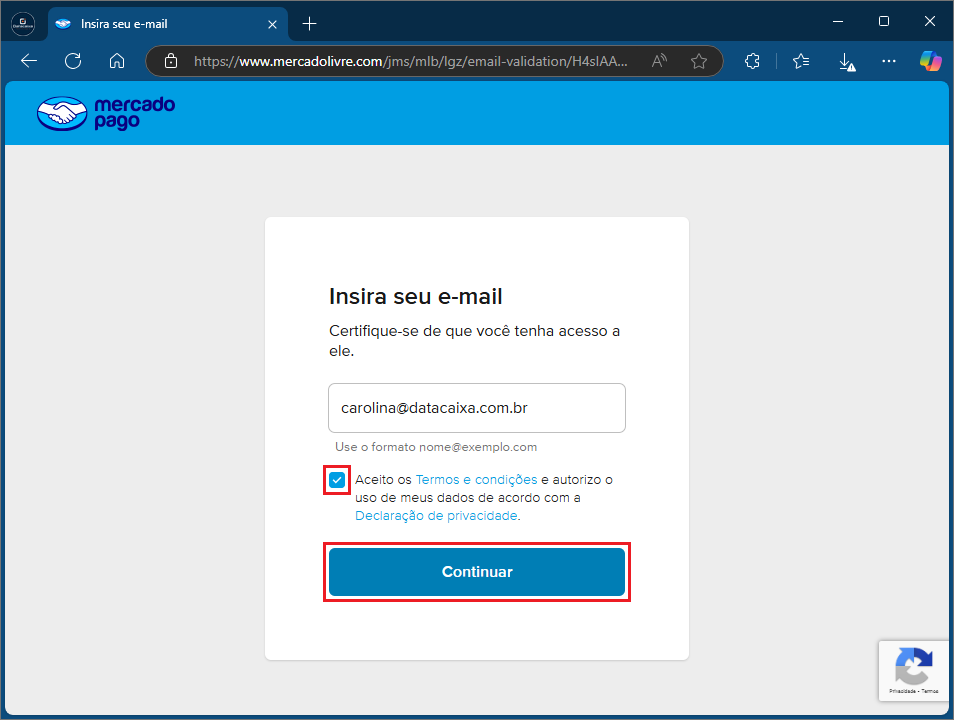 3- Insira seu e-mail e marque a caixa de seleção para aceitar os Termos e condições. Em seguida, clique em Continuar.