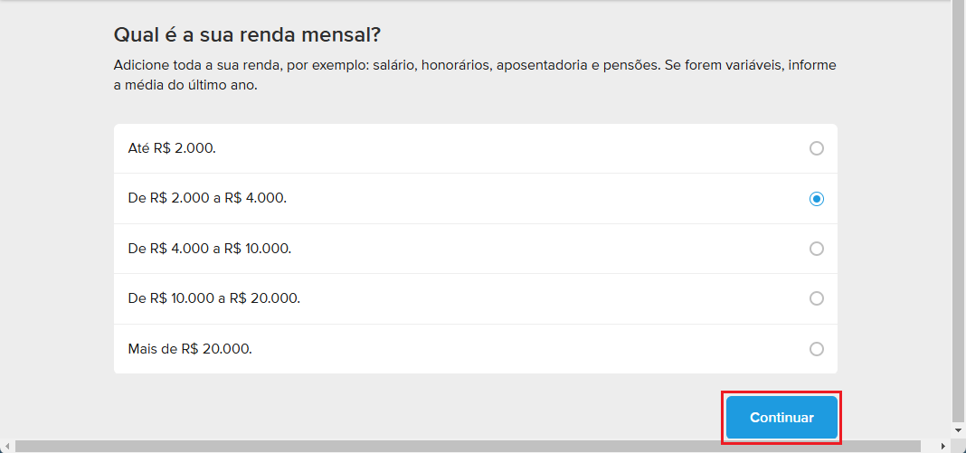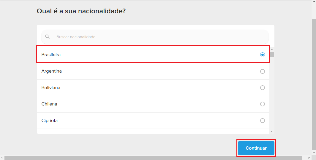 10- Selecione a sua nacionalidade e clique em Continuar.