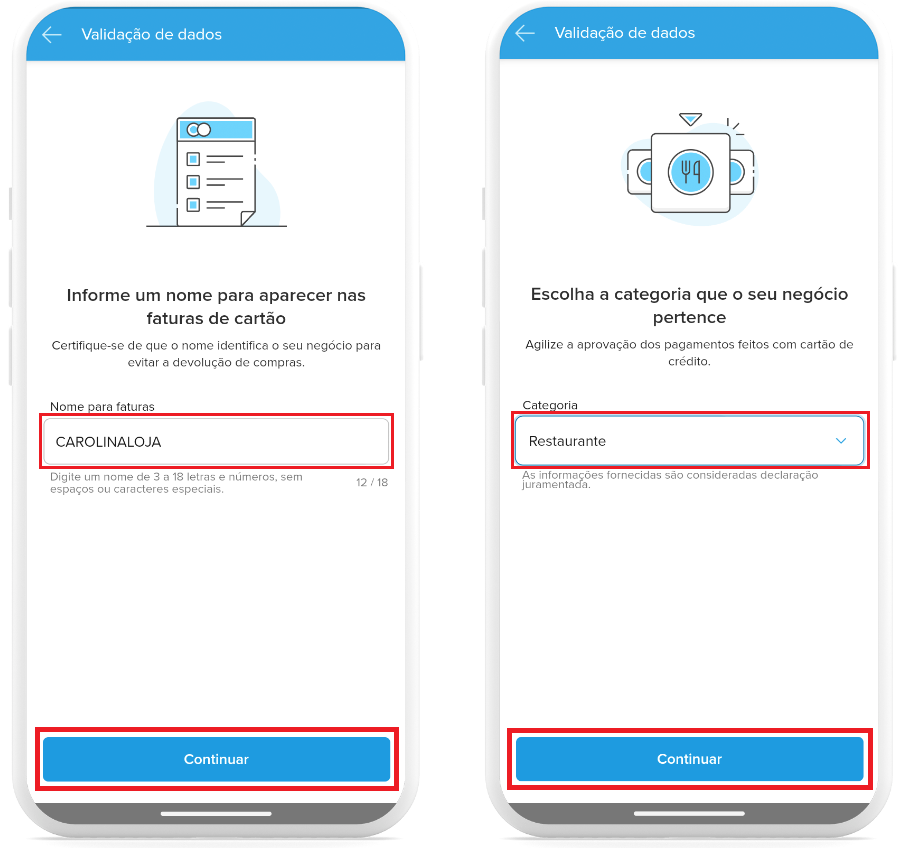 8- Selecione o Nome para faturas > Continuar. Em seguida, selecione a categoria do seu negócio > Continuar.