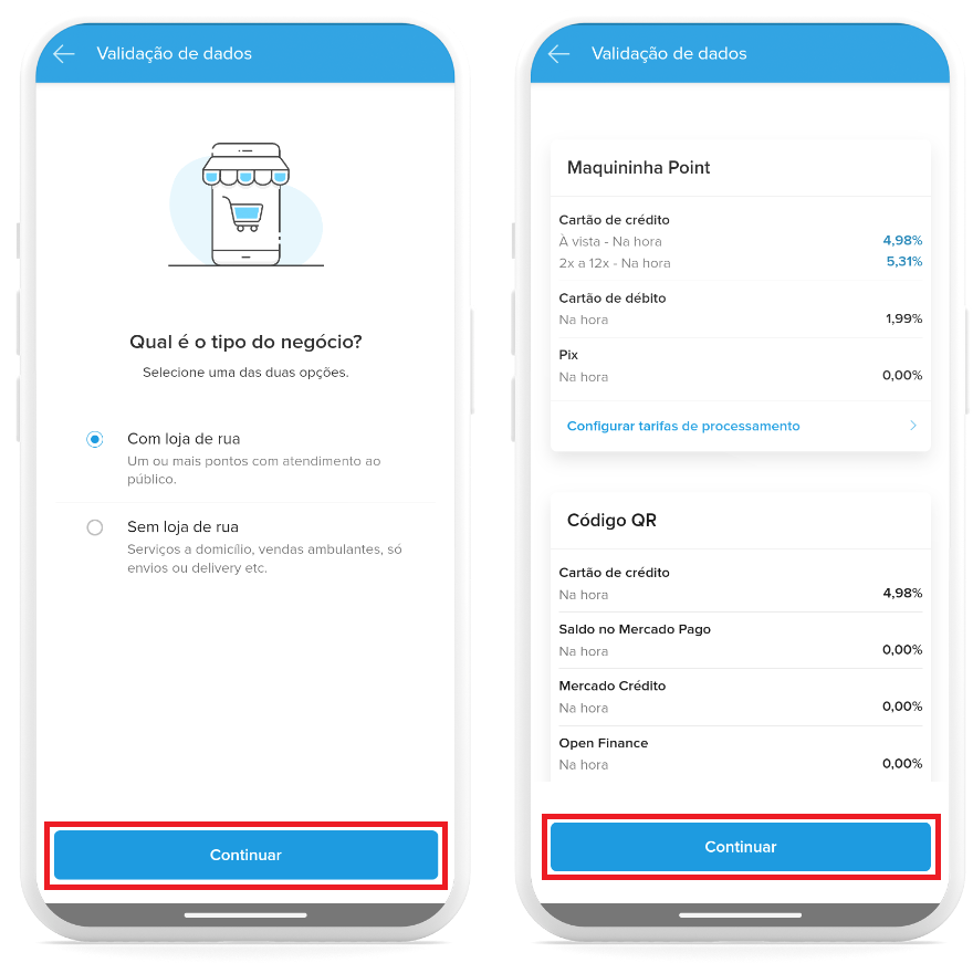 9- Selecione o tipo do seu negócio > Continuar. Logo depois, avance tocando novamente em Continuar.