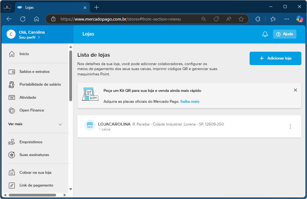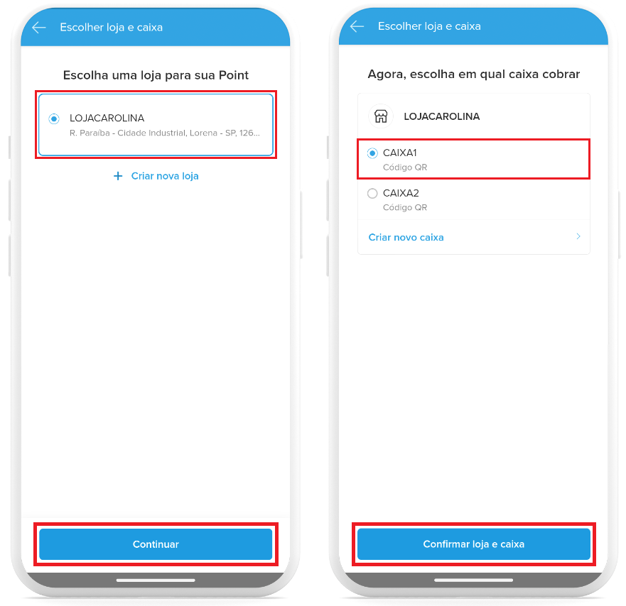 10- Escolha a loja que você criou > Continuar. Em seguida, selecione o caixa que será cobrado as vendas > Confirmar loja e caixa.