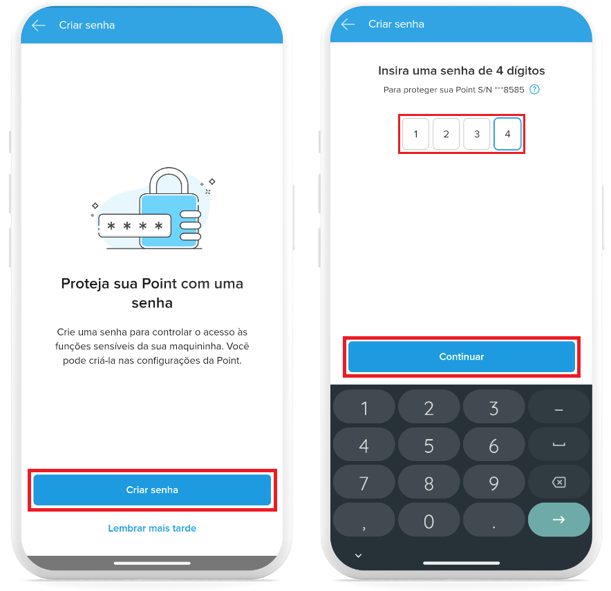 11- Toque em Criar Senha e insira uma senha de 4 dígitos. Logo depois, toque em Continuar.