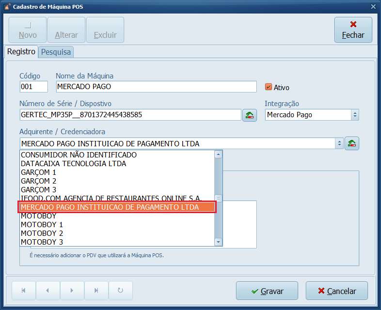 26- Em Adquirente/Credenciadora, selecione o cadastro do MERCADO PAGO INSTITUIÇÃO DE PAGAMENTO LTDA.