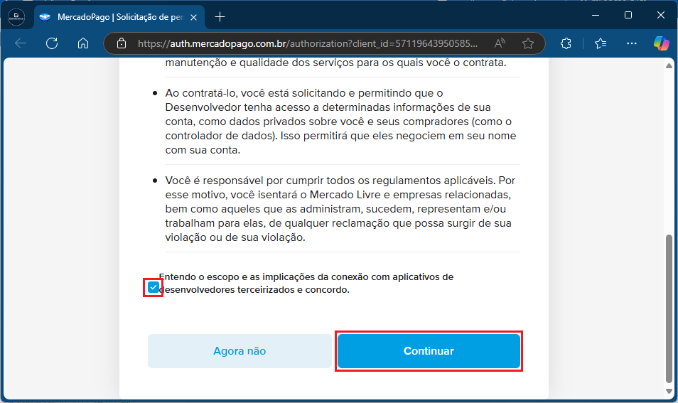 20- Desça até o fim da página e marque a caixa de seleção para autorizar. Em seguida, clique em Continuar.